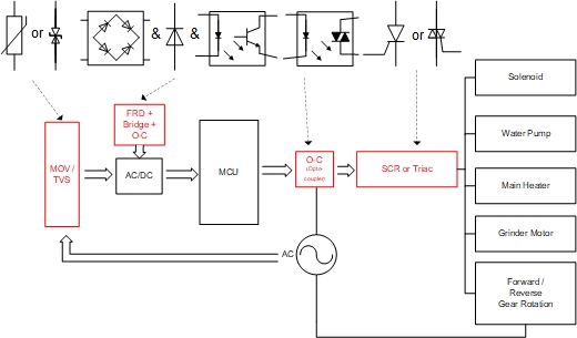 人们把电子技术应用到咖啡机上,实现了磨粉、压粉、装粉、冲泡、清除残渣等酿制咖啡全过程的自动控制,创造了全自动电子咖啡机。 应用于消费电子领域,ok138太阳集团微电 能提供比较齐全的元件解决方案。比如:AC 输入端防浪涌的压敏电阻(MOV)、电源部分用快恢复二极管(FRD, fast recovery diode)及整流桥(Bridge)、光电隔离器件(Opto-coupler)、控制负载通断的可控硅(SCR & Triac)等。