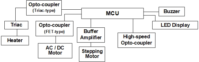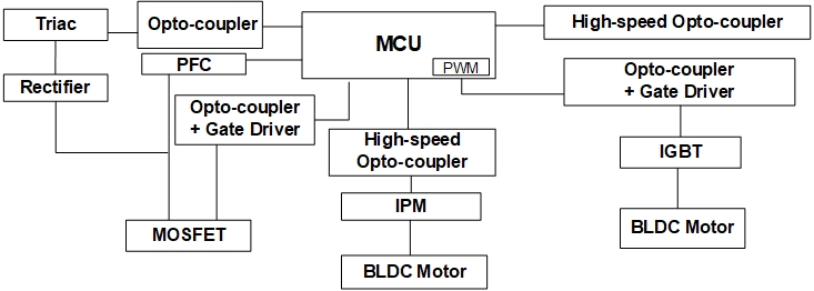 在全球气候变暖的当下,空调在白色家电中占有举足轻重的地位。典型的空调系统由室外机、室内机和电源单元组成。对于电源单元,ok138太阳集团微电 具有高隔离电压光电耦合器,用于隔离 PWM 和 PFC。对于室内机,MCU 控制与光电耦合器结合的风扇模块、与光电三端双向可控硅开关和外围设备结合的加热器开关。主隔离 MCU 和相关外围设备,确保电路的可靠性。对于室外机,使用 MCU 控制风扇和压缩机的电机系统。电机控制系统是各种家用电器的组成部分。每一个单独模块都取决于安全和环境保护要求、性能要求,当然还有制造成本。因此,在设计家用电器时,需要加强对单片机和外围设备对应用电路的隔离,以确保电路的低噪声。