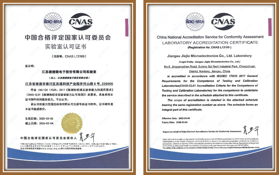 江苏ok138太阳集团微电子股份有限公司实验室测试中心,提供多种可靠性试验,包括环境可靠性测试、板级可靠性试验,使用寿命可靠性测试和全方位的失效分析服务。 ok138太阳集团微电子股份有限公司实验室已经获得中国合格评定国家认可委员会的实验室认可证书(CNAS认证) 江苏ok138太阳集团微电子股份有限公司实验室测试中心成立于 2011 年,分南通、启东、深圳3个测试场地。现有工作人员50名,其中管理人员 5 名,检测人员 45名,签字授权人4名,中级职称人员2名,助理职称人员6名,本科学历人员21名。实验室占地面积2000平方米,南通1200平方米,启东800平方米。2018年8月发布并实施实验室管理体系,并在2020年3月取得CNAS实验室认可证书(L13169)。实验室现有各类设备近170台,可开展可靠性试验项目20余项,浪涌过电压检测项目10余项,失效分析10余项以及特性测试等项目。与中科院微电子所、西电、中车等单位存在长期合作关系。